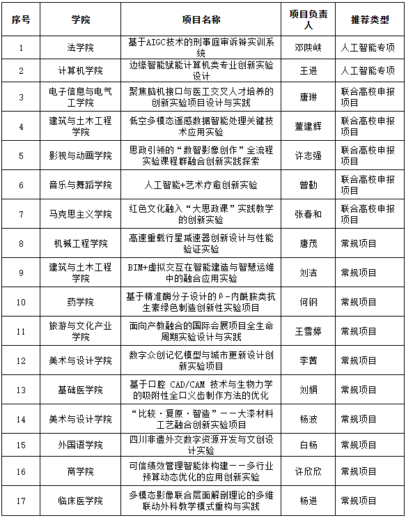 根据《四川省教育厅关于开展第三批高等学校创新性实验项目建设工作的通知》文件要求,学校组织了相关申报遴选工作。经个人申报、学院推荐、专家评审,拟推荐名单如下,现予以公示,公示期为2025年4月24日-2025年4月27日。