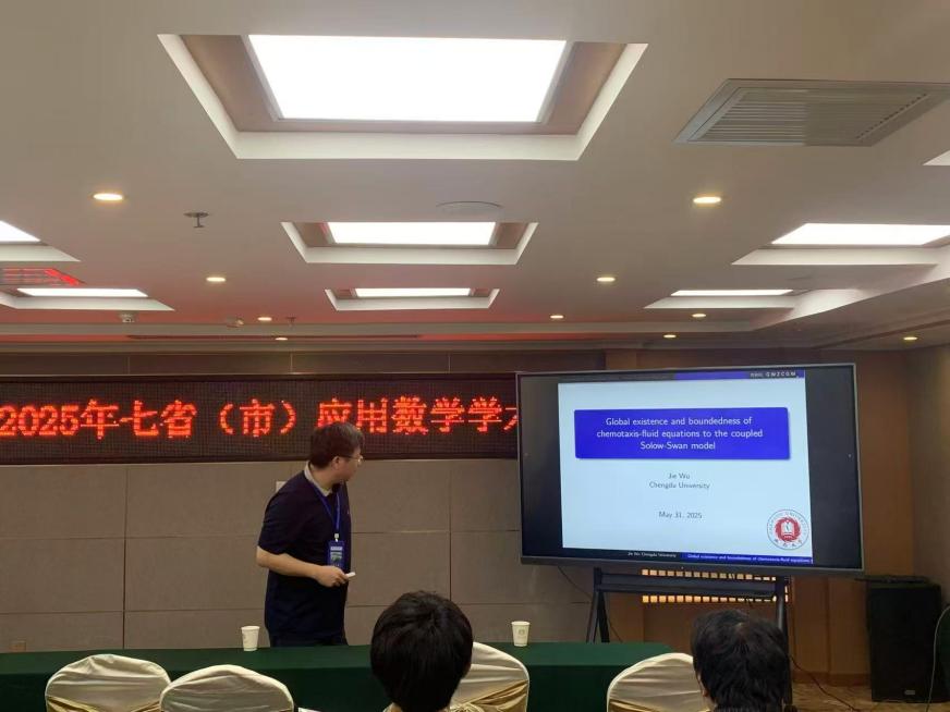 教师吴杰博士应邀参加会议,并在大会上了做了题为“趋化-流体方程耦合的Solow-Swan模型的整体有界性和渐近行为”的专题报告。该报告介绍了趋化模型近些年的进展,并介绍了作者近些年在趋化模型方面起得的一些成果。最后通过介绍经典的Trudinger-Moser不等式以及改进后在生物学中好应用的二维临界情形。作者通过将该不等式用于带有流体情形的Solow-Swan模型,给出了其解的整体存在性和有界性。最后考虑加入logistic源后得到衰减估计的结果。报告内容引起了广泛的关注和讨论,提升做爱视频