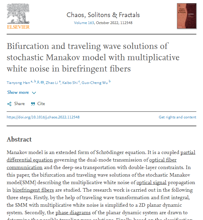 电信学院施开波和内江师范学院吴国成等合作,以平面动力系统理论和椭圆积分为主要手段,研究了双折射光纤中具有乘性白噪声的随机Manakov方程的分支、相图、光孤子和行波解,所得到的解进一步解释了在非线性光学中光孤子的传播情况。