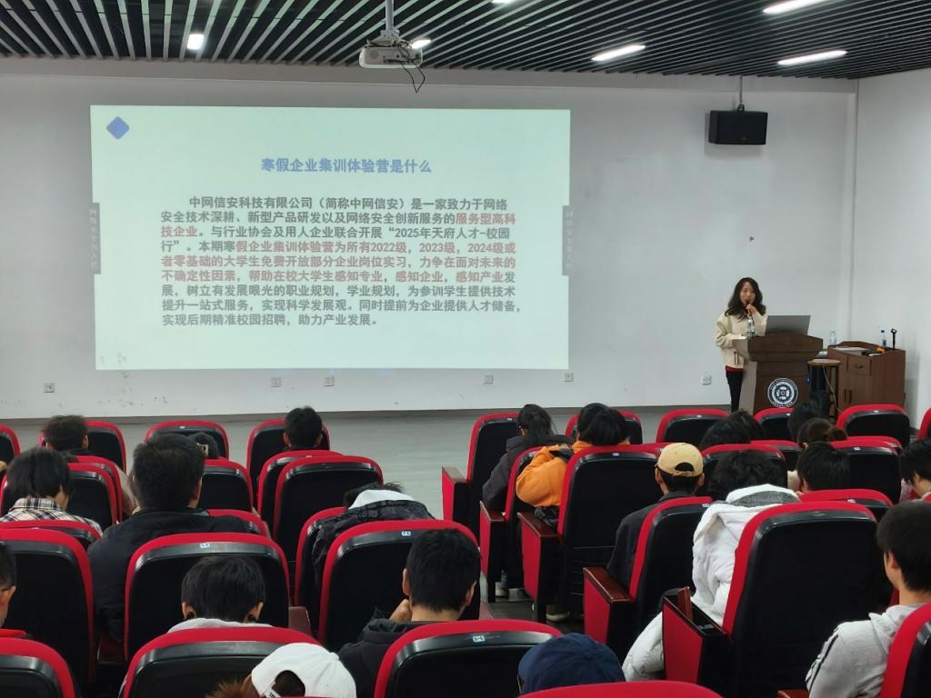 徐海军以其深厚的专业知识和丰富的实践经验,深入剖析了网络安全的核心特征与作用原理。从钓鱼网站这一网络安全事件出发,逐步引导同学们认识到网络安全的重要性及其潜在的发展空间,为同学们就业提供了新方向。最后,由另一位主讲人详细介绍了中网信安公司,以及冬令营的详细安排。
