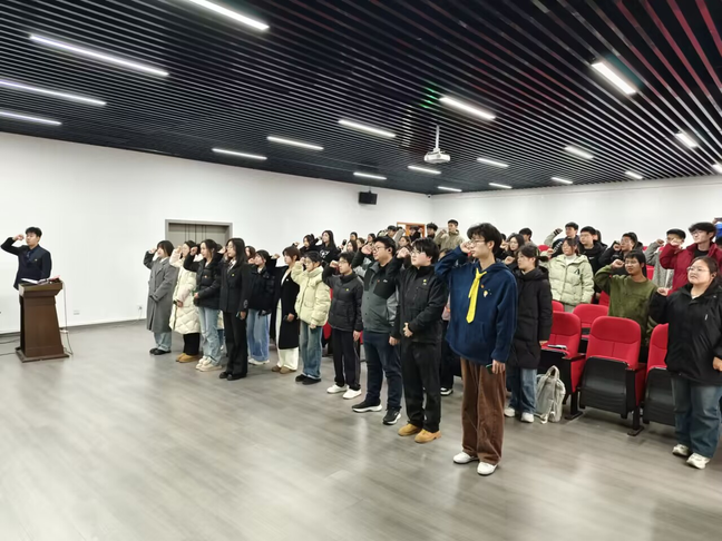 紧接着,宣誓礼庄重举行。全体新团员在张文治的带领下,面向鲜艳的团旗,高举右拳,庄严宣誓:“我志愿加入中国共产主义青年团,坚决拥护中国共产党的领导,遵守团的章程,执行团的决议,履行团员义务,严守团的纪律,勤奋学习,积极工作,吃苦在前,享受在后,为共产主义事业而奋斗。” 誓言铮铮,回荡在会场,展现出新团员们坚定的信念和对共青团的无限忠诚,他们用青春的声音许下了为共产主义事业奋斗终身的承诺。