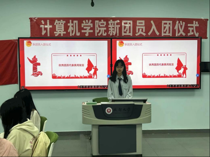 优秀团员代表黄月也上台发言,讲述了自己在共青团组织中的成长经历和收获,鼓励新团员们珍惜青春时光,在团组织的怀抱中锻炼自己,追求卓越,发挥模范带头作用,为实现中华民族伟大复兴贡献力量。