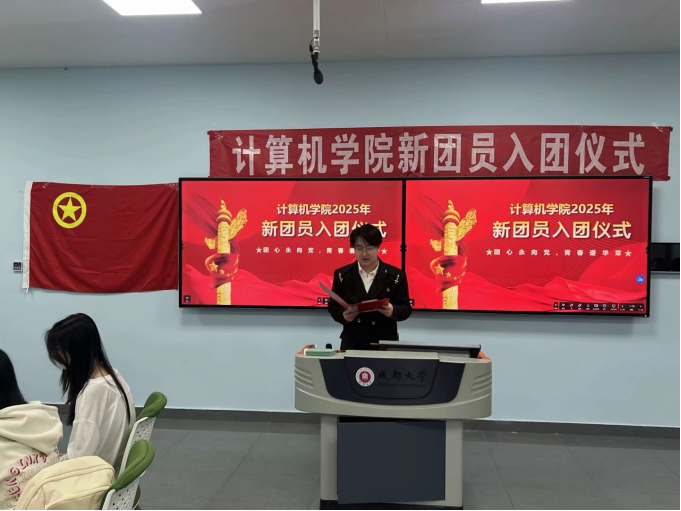 学生会主席、共青团员董凯文主持,学院团委书记曾倩出席,2025年新发展团员、优秀党团员代表齐聚一堂,共同见证这一庄严而神圣的时刻。