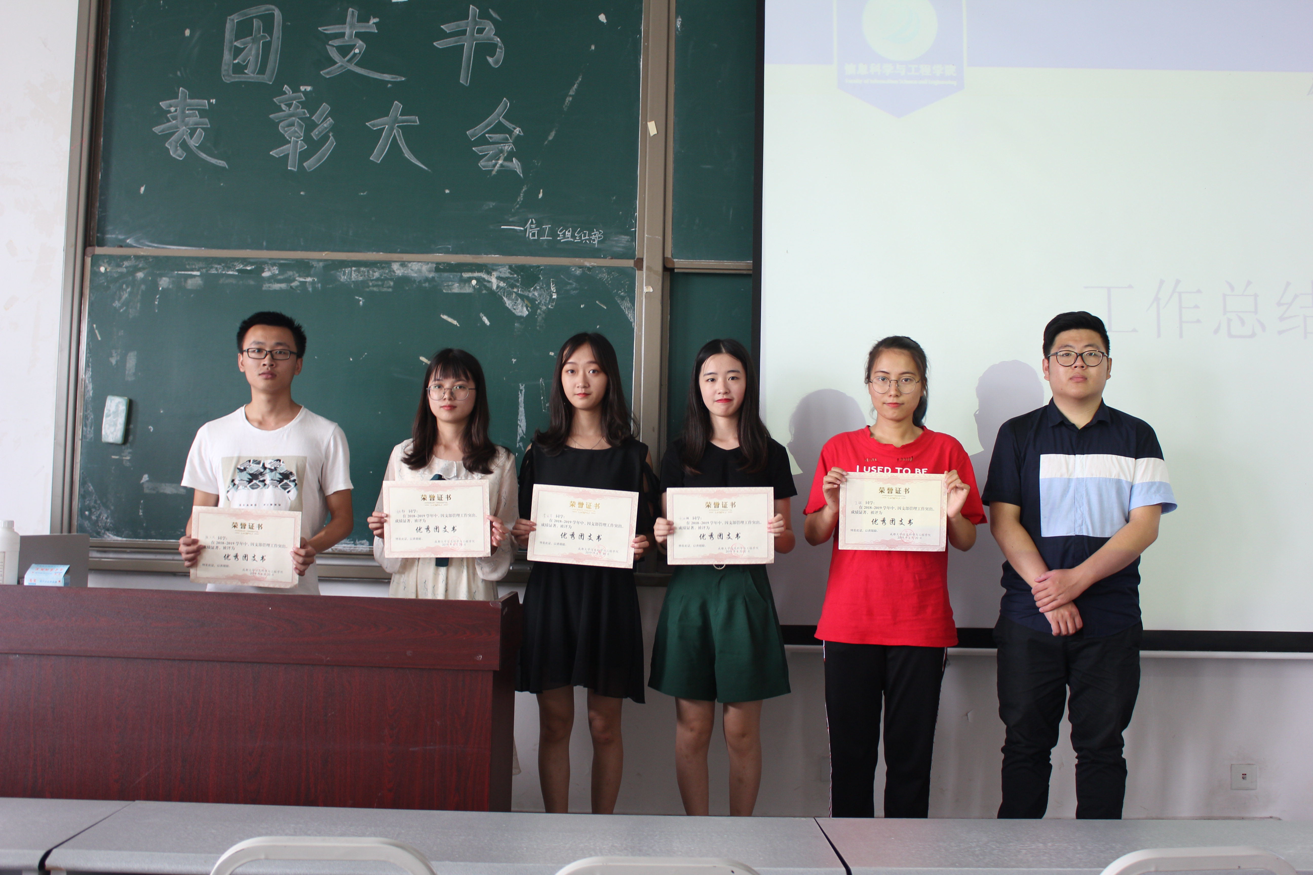 大会伊始,全体起立齐唱团歌。之后,由组织部干事赵辉进行工作总结,他通过自身工作情况和团组织生活情况,总结了这个学期的工作任务的优点和缺点。接下来是大会的颁奖环节,获得本学年优秀团支书的分别为18级自动化2班王银、18级电信1班姚静、18级通信3班刘泓麟、18级电信3班李丽莎、18级软工4班殷入风,由分团委副书记张懿勃为他们颁奖。然后,团支书代表王银上台发言,首先她表示对组织部成员的感谢,因为有他们的帮助,团支书的工作才得以顺利开展。最后,分团委副书记张懿勃进行了致辞,首先他对团支书在这一学年的工作表示认可,同时指出,团支书作为班上重要的领导人物,辛苦且重要,在组织班上活动时应该要提高班级同学的凝聚力,希望团支书们在新的一年里继续努力。