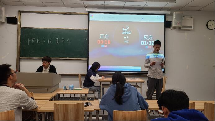 辩论队队长谭杰担任主持人,辩论队队长韩璐新担任评委。