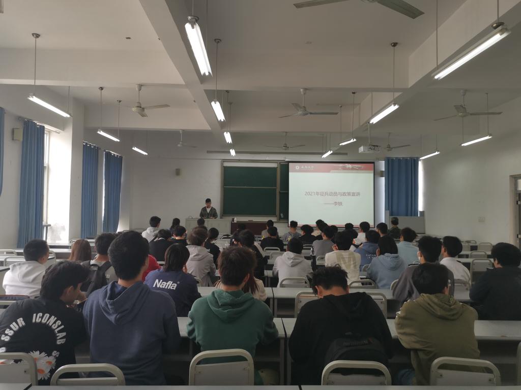 在十教10201教室举行了大学生征兵工作宣讲会。学院党委副书记孟源、退役教师孟飞、退役学生谢苏韬及做爱视频