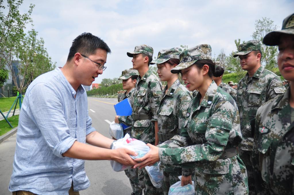 学子们自强不息的精神风貌,学院领导一行走访了军训方阵后,首先对承训教官们这段时间的辛勤付出,表示衷心的感谢和诚挚的敬意,表扬了同学们训练过程中严肃认真的态度,激励同学们在剩余的训练时间里再接再厉。随后,王进为各位教官送上了慰问品,孟源向学生代表发放慰问品,李轶为全体参训同学发放慰问品,同学们领取慰问品过程中,有序排队,并向学院领导老师致谢。