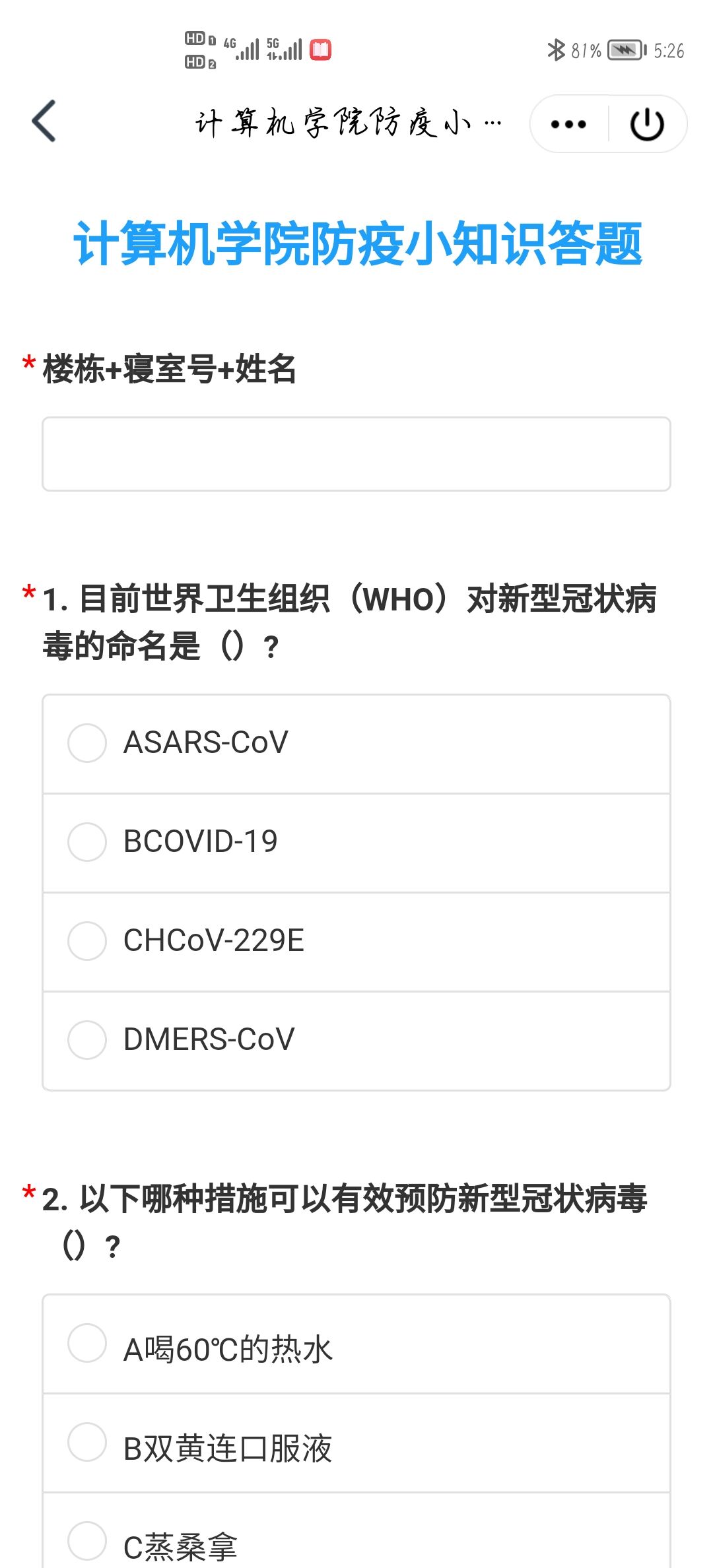 11月24日至30日,学院充分利用线上资源,制作防疫知识竞赛小程序,全院共计95间寝室参与防疫知识竞赛答题,有效提升了学子在疫情防控常态化阶段的防疫意识和常识,知晓科学防疫方法、遵守疫情防控规定、积极配合学校和属地防疫政策既是每位学子应尽的义务,也是大家齐心协力战胜疫情的必经之路,特别是在寝室内部,人员相对聚集,防疫难度较大,同学们一定要积极主动配合做好疫情防控工作,掌握特殊情况应急处理办法,确保安全。