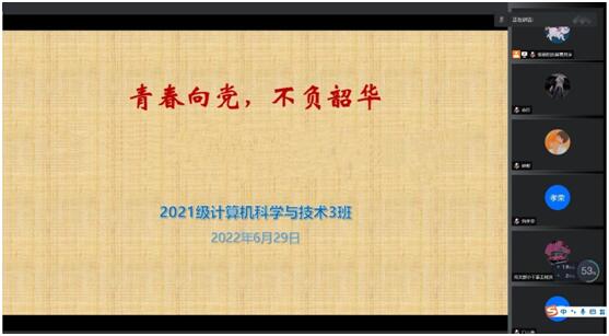 本网消息(文/弋佳 图/2021级计算机科学与技术专业3班)2022年7月6日19时,2021级计算机科学与技术专业3班团支部在线上召开了“青春向党,不负韶华“的主题活动。