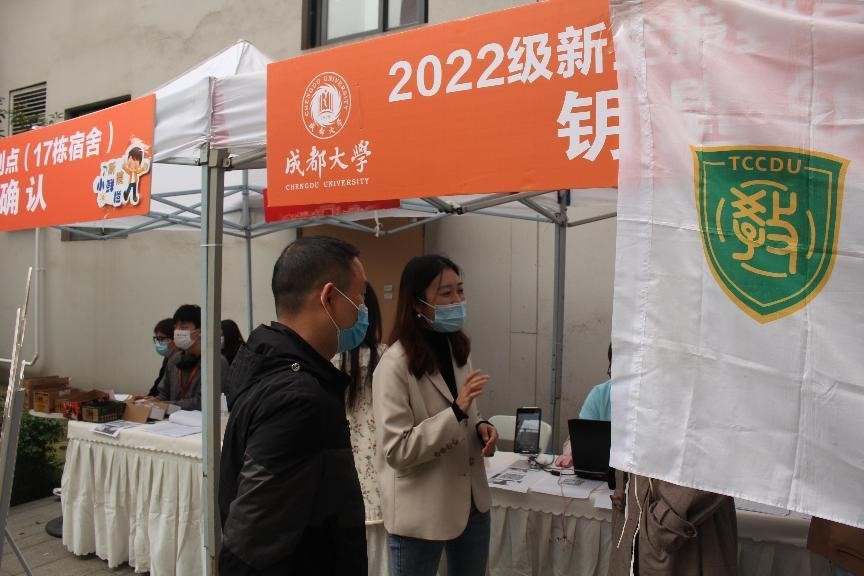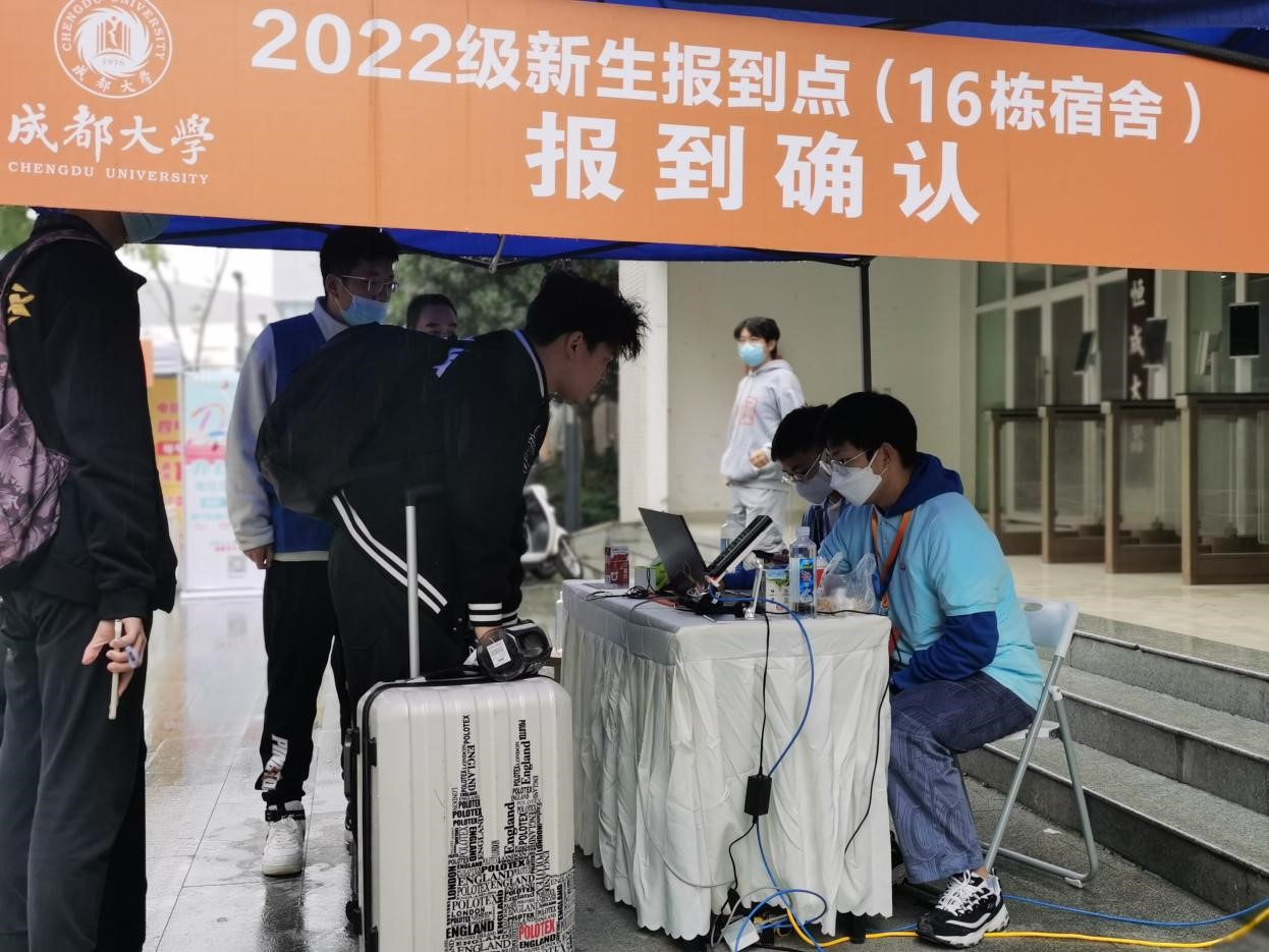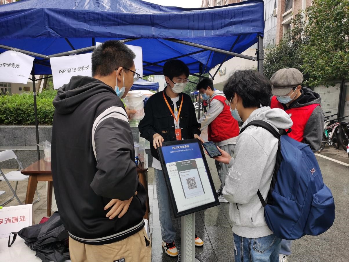 新生乘坐大巴车到达15、16栋寝室楼下后,在学院制作的背景墙前合照留念。在寝室楼栋前报到处,志愿者协助做好行李消毒、二次测温,新生刷脸进行信息核验,查验7天ISP健康登记信息、天府健康通“绿码”、行程卡、返校前24小时内核酸检测阴性证明后,领取一卡通和防疫承诺书之后完成报到。新生报到后第一时间完成核酸检测,领取“完成核检卡”,填写姓名、寝室号后交到宿管处,在等待核酸检测结果之前工作人员组织新生在寝隔离。学校食堂为新生提供预订三餐和送餐到勤服务。