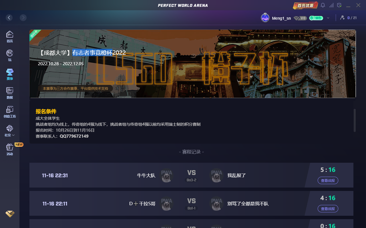 电竞社向完美世界对战平台申请校园比赛,全程比赛在完美世界对战平台线上进行。