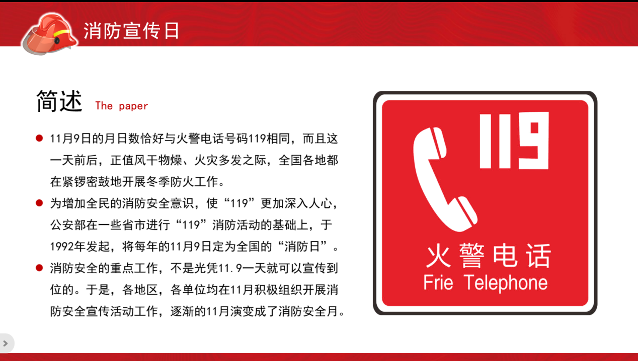 11月19日是我国“119”消防日,在这前后也正是风干物燥、火灾多发之时,全国各地都在紧锣密鼓地开展冬季防火工作。火灾源于生活,我们要做好防火工作,掌握防火十法,在火灾之前懂逃生之道,知灭火之招,时刻谨记消防安全。黄心宇普及了常用消防知识及消防器械使用方法,让我们对灭火器械有了更深的了解。