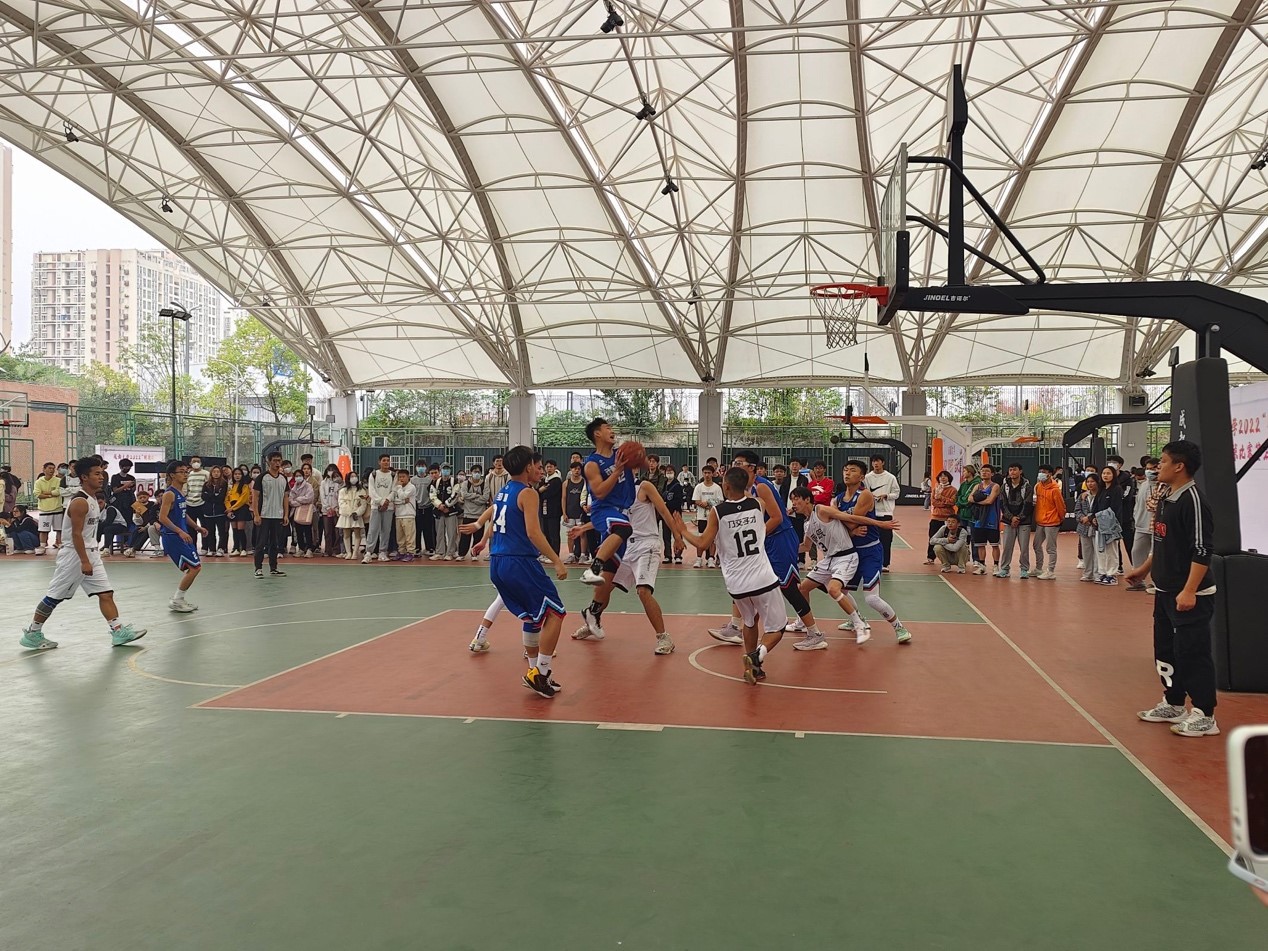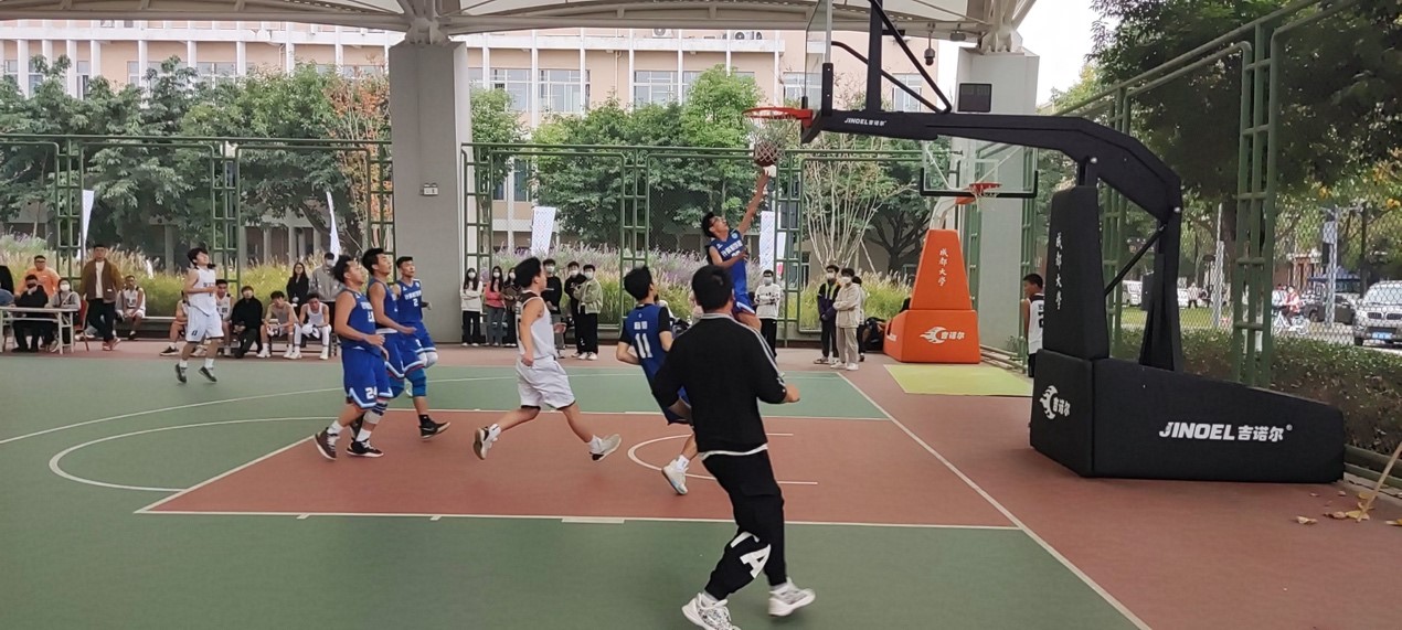 和旅游与文化学院在风雨篮球场展开了第一场篮球赛。学工办老师饶涛莅临现场为球员们加油打气,本场比赛有50多位观众到场观看。