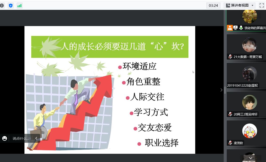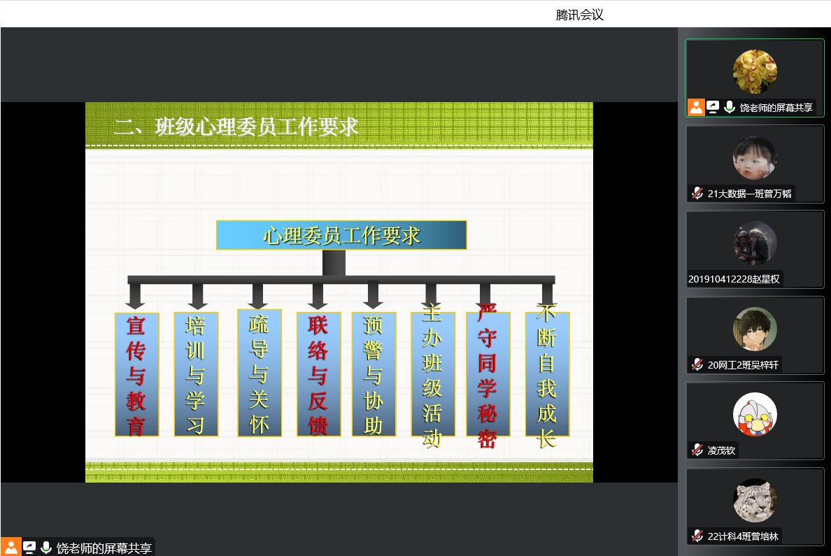 召开班级心理委员线上培训会,各班心理委员参加。本次培训由学工办饶涛老师主讲,心生部组织策划。