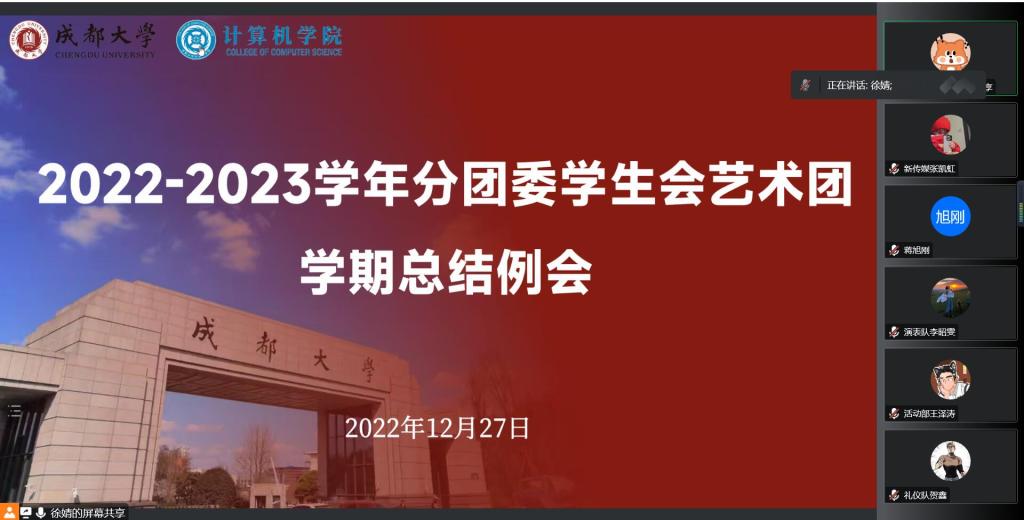 2022年分团委、学生会、艺术团年度总结大会在线上顺利召开。此次会议由学生会主席徐婧主持。学院分团委书记龚硕,主席团成员、艺术团秘书长、各部门部长及干事全体参加。