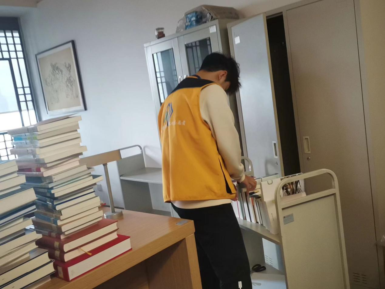 与此同时,另一边的志愿者们按照要求对杂乱的书籍进行整理、分类、摆放,志愿者们分工合作、有条不紊,在短时间内将大量杂乱的书籍摆放得整齐有序,让书架和书桌变得干净整洁,使得整个阅览室焕然一新、舒适美观。