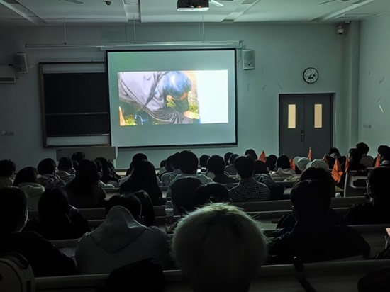 当天下午,同学们早早来到教室,有序签到。6点30分,活动开始,随着电影《忠犬八公》的放映,教室里时而欢声笑语,时而泪目哭泣,电影中的情节和角色表演引发同学们的共鸣。