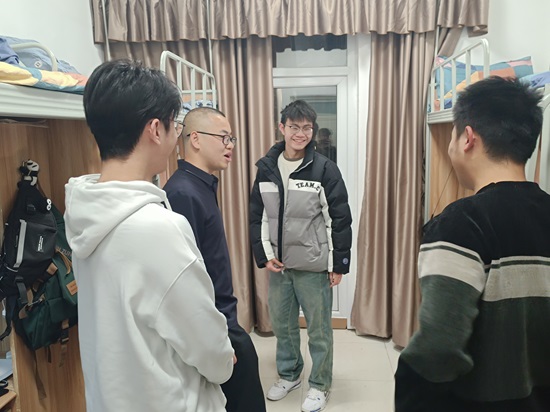 学工办辅导员走进学生宿舍,走访宿舍学生。