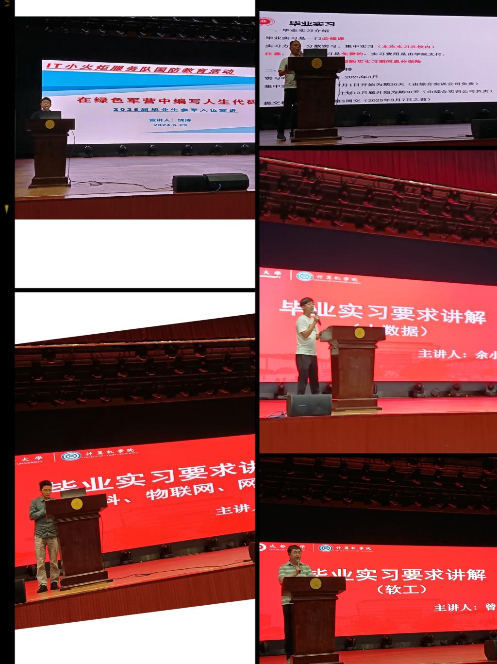 大会首先由王进做实习动员,强调实习的重要性和必要性,同时围绕“实习情况说明”及“实习纪律与安全教育”做详细的讲解,他从实习的意义、时间、对口企业、纪律、安全等方面讲解,强调学院对实习的重视,提醒学生要遵守国家法律法规;遵守实习纪律、实习单位规章制度,合理规划时间,顺利完成实习报告的撰写。接着,各系部主任结合各专业特点,介绍当前就业市场的整体形势,指出计算机专业毕业生的就业前景广阔,但也存在竞争压力,并详细介绍了本专业的就业前景、实习机会和升学深造情况,鼓励毕业生根据自己的兴趣和专长,选择适合自己的发展方向,并提前做好充分准备。辅导员饶涛开展了征兵入伍宣讲动员,期望每一个热血青年都积极参与,将个人的锻炼和成长与祖国的发展紧密集合起来。最后,孟源强调了实习对于毕业生未来就业的重要性,建议同学们在实习期间认真学习、积累经验,提高自己的实践能力和综合素质,同时,提醒毕业生要认清形势、明确目标、早做准备,积极抢抓就业机会。