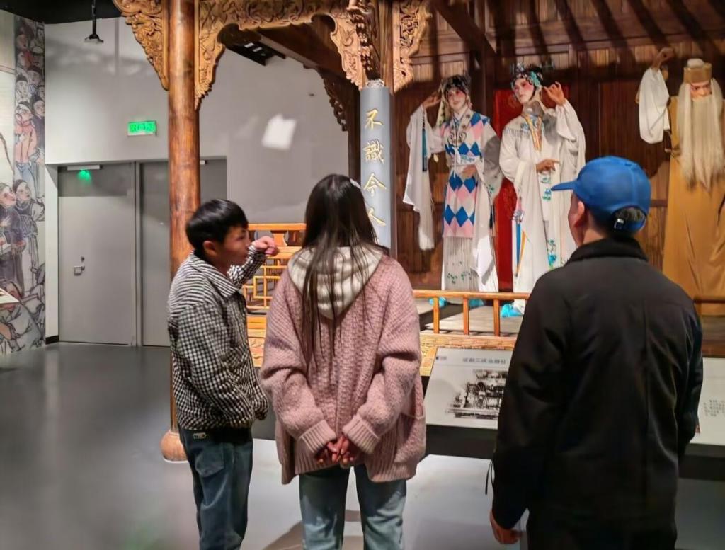 移步至民俗展区,精美的戏服如同绽放的花朵,绚丽的蜀绣恰似天边的彩霞。同学们无不赞叹震撼于这座精湛的戏台。其细腻的布置,丰富的色彩和寓意深远的图案,让大家对古代成都高度发达的手工业和繁荣文化有了更深刻的体会。
