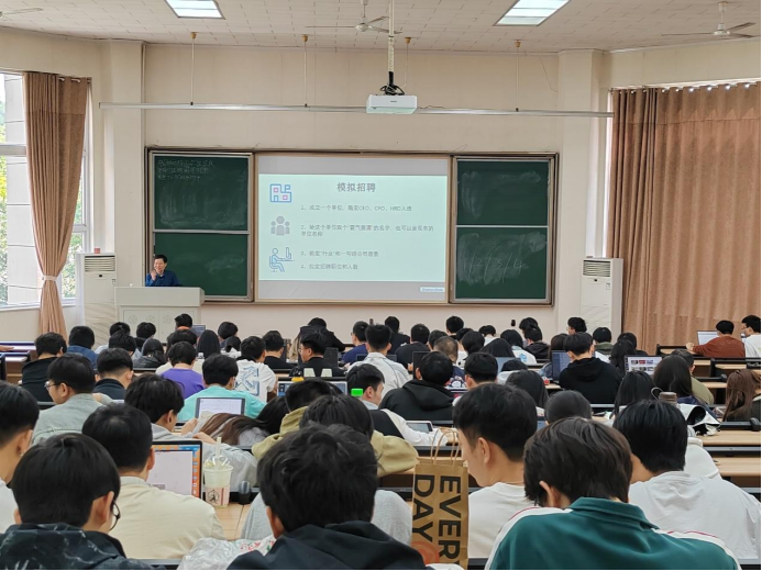 向星星从后疫情时代的就业市场进行分析,结合自身经历、加上相关实际案例,以幽默生动的话语向同学们分享了职业发展所需要的专业素养,引导同学们思索自己的生涯规划。随后,带领同学们进行模拟公司,将公司主要因素进行一一分析,如:公司核心人物的选拔、选定霸气侧漏的公司名字、指定公司的文化、拟定未来发展方向、选拔人才;接着,进入模拟招聘环节。同学们自行组队成立单位,按要求规划公司愿景,并确定CEO、CFO、HRD人选,拟定招聘职业和人数。期间,同学们积极参与讨论,与向星星老师进行热烈深入的互动。