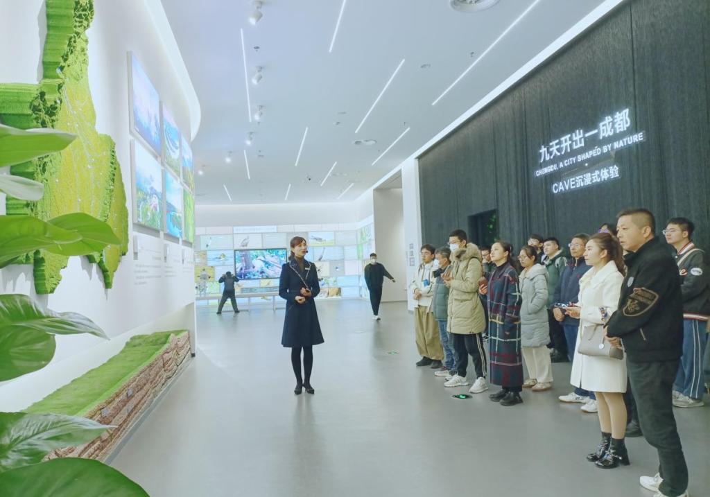 活动开始时,讲解员带领大家参观了城市历史厅,展示了成都从古蜀文明到近代的变迁历程。在战略定位和战略目标厅,介绍了成都作为“国家中心城市、美丽宜居公园城市、国际门户枢纽城市、世界文化名城”的内涵、特征及发展策略。三楼的全域实体模型展示吸引了同学们的目光,展示了成都的城市空间格局转变和市域空间结构等规划信息。在以“乡村振兴”为主题的展示空间,同学们感受到了独特的林盘意境空间。