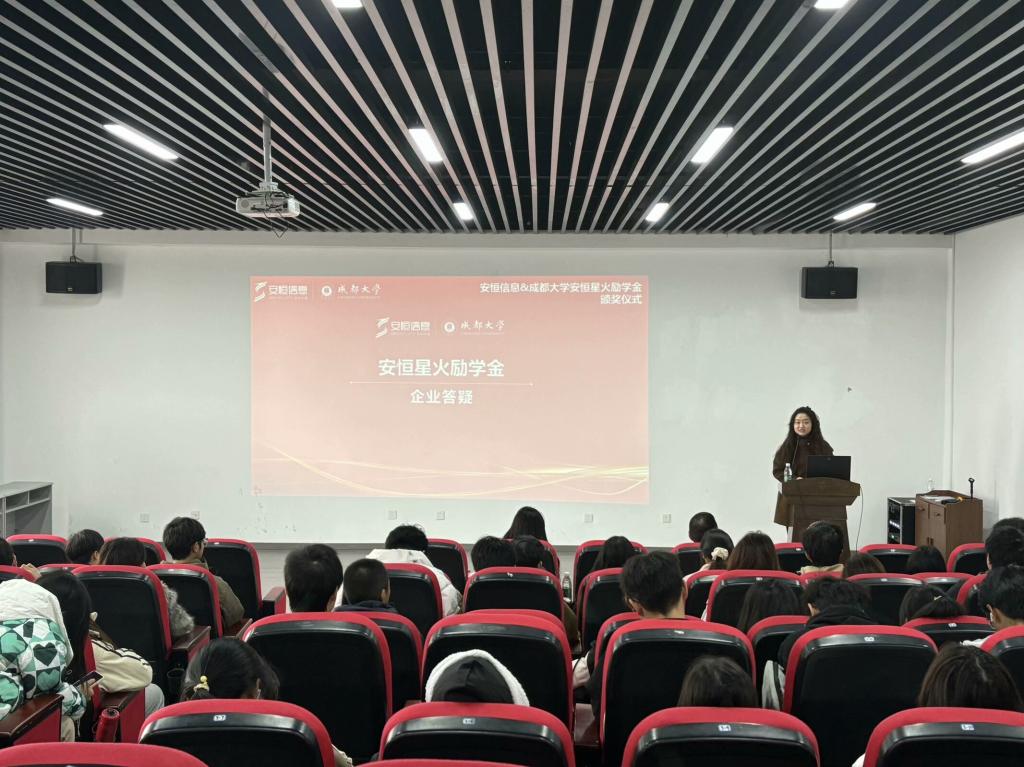 紧接着,安恒信息人力总监蒋雨开启了企业答疑环节。蒋雨以其丰富的行业经验和敏锐的洞察力,深入浅出地介绍了安恒信息基本情况。她耐心解答了同学们关于职业规划、行业发展趋势等诸多方面的疑问。