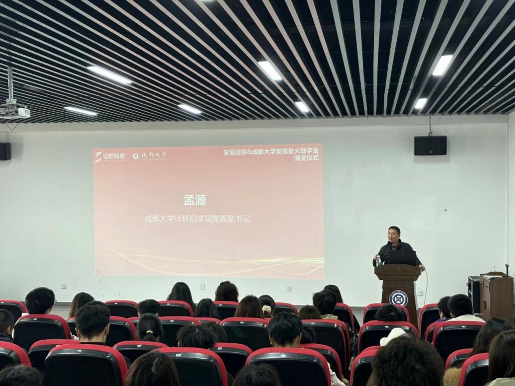 随后,蒋雨为获奖的10名杰出学生颁发了“安恒星火”励学金。获奖学生王子虚发表了感言,感谢学院和安恒公益的支持,并分享了自己在专业学习、学术和社会活动中的成就及未来的职业发展规划,表示将倍加珍惜这份荣誉,努力学习,勇攀高峰,追求更高的学业成就。