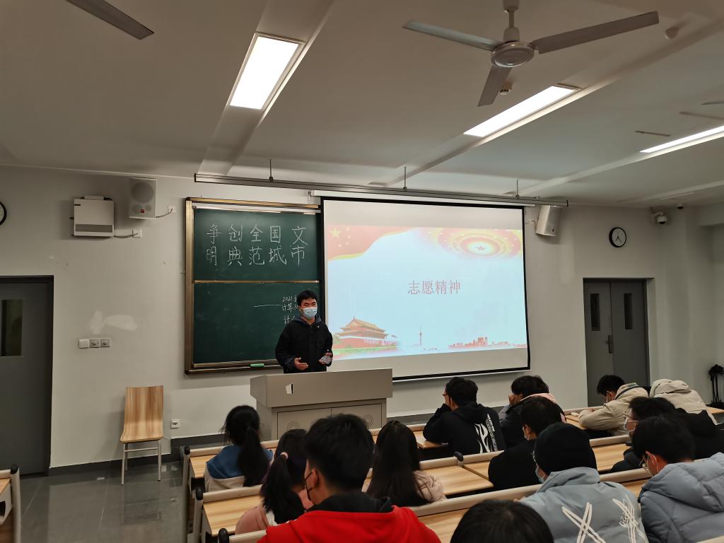 随后,曹俊讲解志愿服务精神。志愿服务是社会文明进步的重要标志。“奉献、友爱、互助、进步”的支援精神,展现着向上向善、诚信互助的社会文明风尚,既传承了中华民族助人为乐、扶贫济困的传统美德,又体现了公民的社会责任意识和城市温度。学校是城市文明建设的一部分,营造优美校园环境,打造特色校园文化,就是献力城市文明建设。鼓励大家积极加入志愿者行列,在服务社会中提升自我,不断传递爱与温暖,传递向上向善的力量。
