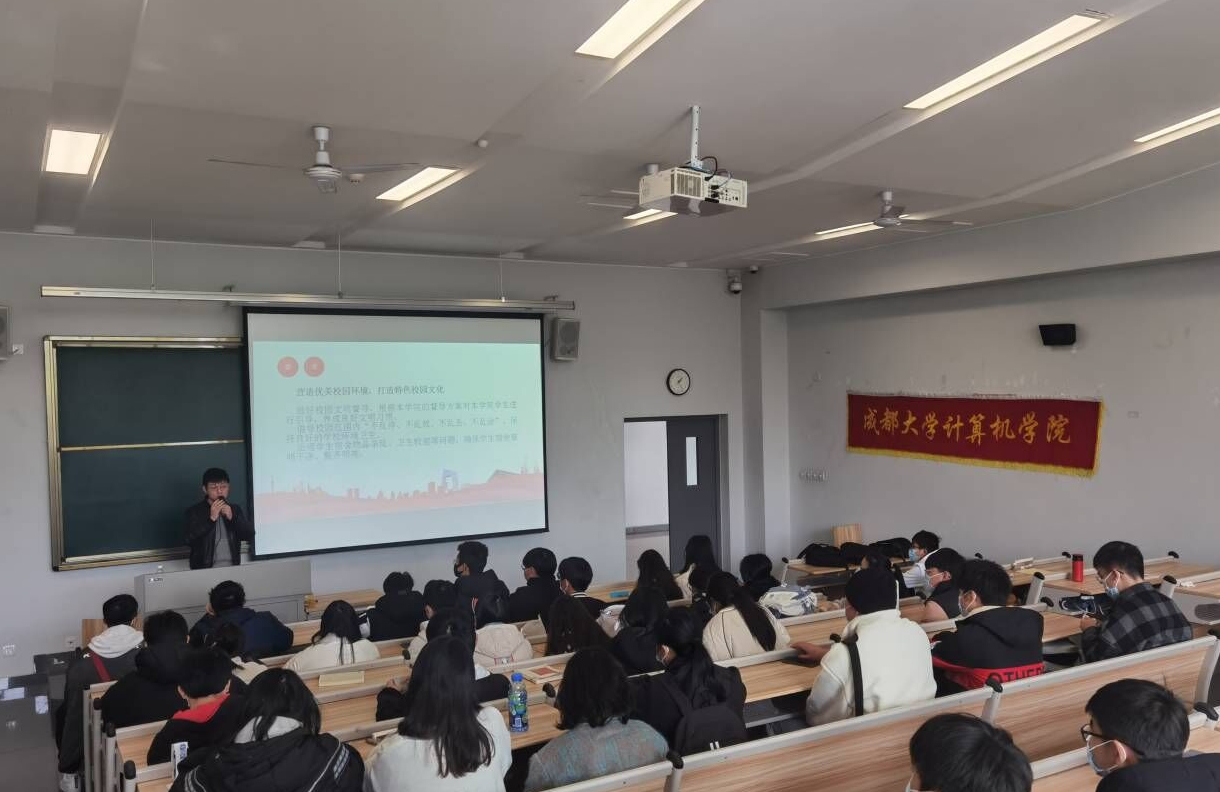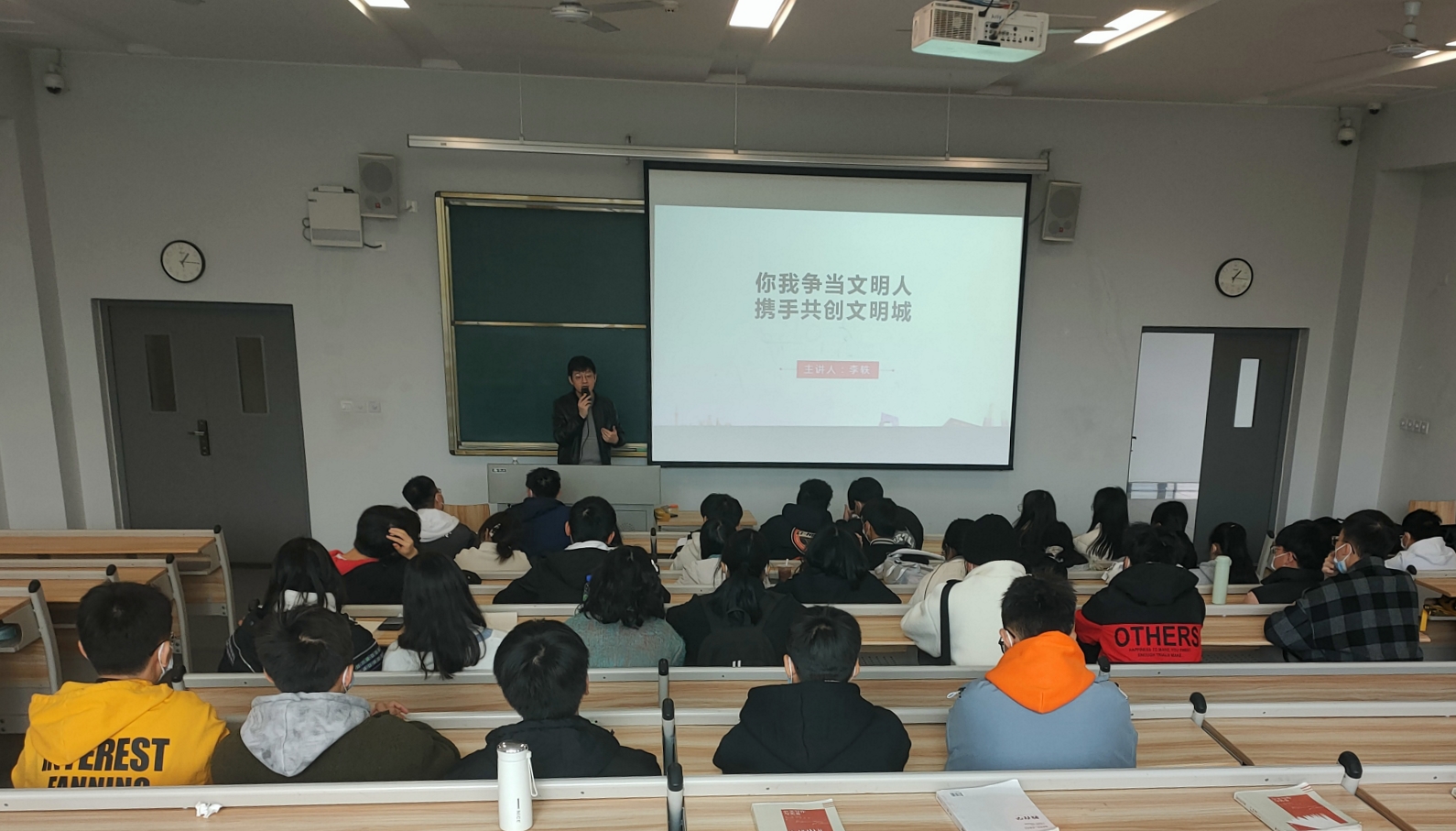 班会伊始,李轶首先向同学们传达了成都市深化全国文明城市创建暨争创全国文明典范城市动员大会会议精神,全国文明典范城市是一座城市综合实力、形象魅力、发展活力、治理能力的集中体现,创建全国文明典范城市,事关成都发展大局、事关市民切身利益,而作为在校大学生的我们,应该主动融入城市建设发展大局之中,强化个体精神文明建设,严守个人行为文明规范,用实际行动支持城市发展,体现新时代大学生的责任与担当。