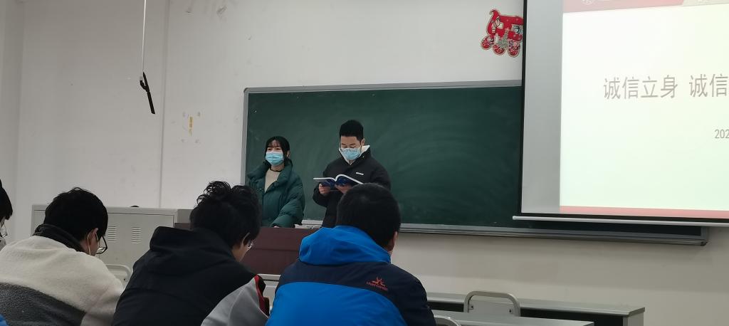 班会上,敬晶向同学们传达了诚信教育的目的,让同学们认识到要积极遵守学校的规章制度,要对大学的考试有正确的认识,加强复习,积极应考,诚信考试,杜绝作弊。同时,宣传了学校的相关规章制度,详细说明了违反考试纪律的相关处分,以及作弊会带来的影响,逐条逐款解读学校学生管理规定、违纪处分规定、课程考核管理办法及考场纪律等相关条文,也让同学们了解到诚信考试背后的更深远的意义。
