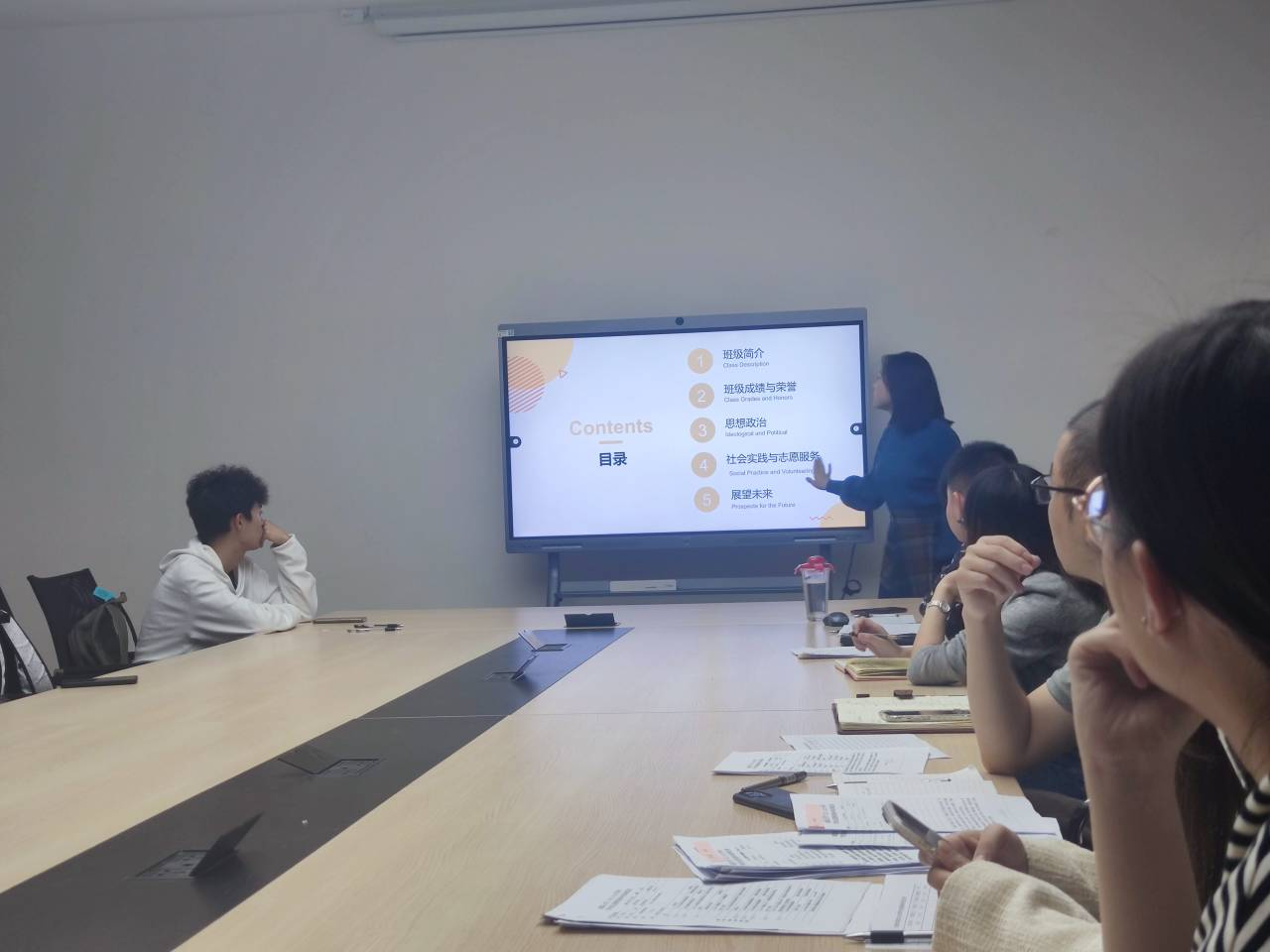 各班代表按照事先规定的顺序,通过PPT或视频形式,在有限的时间内全面展示班级的亮点。他们详细介绍了班级在思想道德修养、学习综合情况、科研学习成果以及社会志愿服务等方面的卓越成绩。现场的激烈地陈述和有序地展示给评委留下了深刻印象。