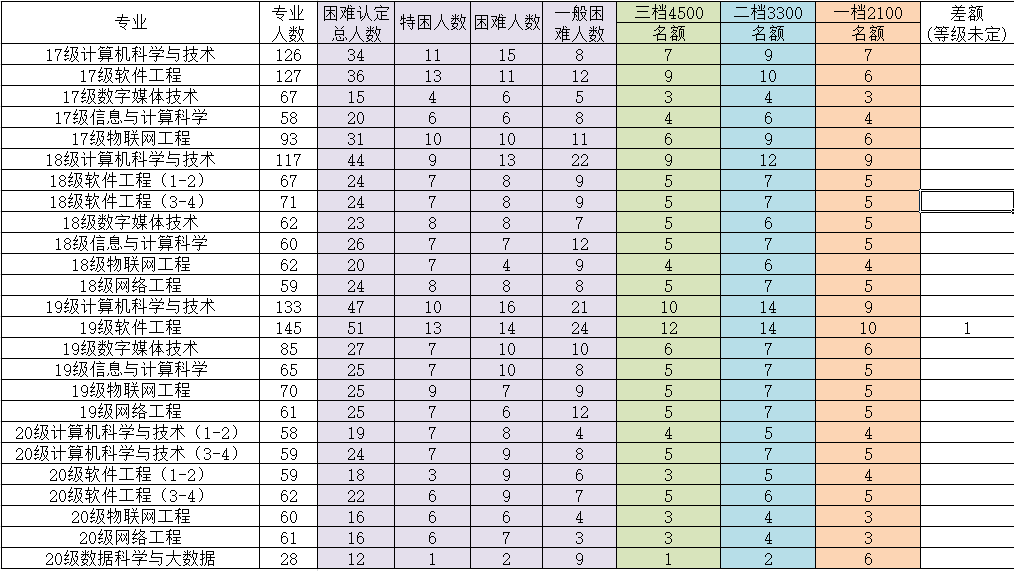 专业根据学院分配的名额(不得擅自变更资助人数和档次)及申报人的家庭经济、思想品德、学习生活、遵守校纪校规等情况评审确定拟助对象名单及国家助学金资助档次(分为2100元/人•年、3300元/人•年、4500元/人•年三个档次),并在本专业内进行不少于1个工作日的公示。公示无异议后报学院国家奖助学金评审委员会。