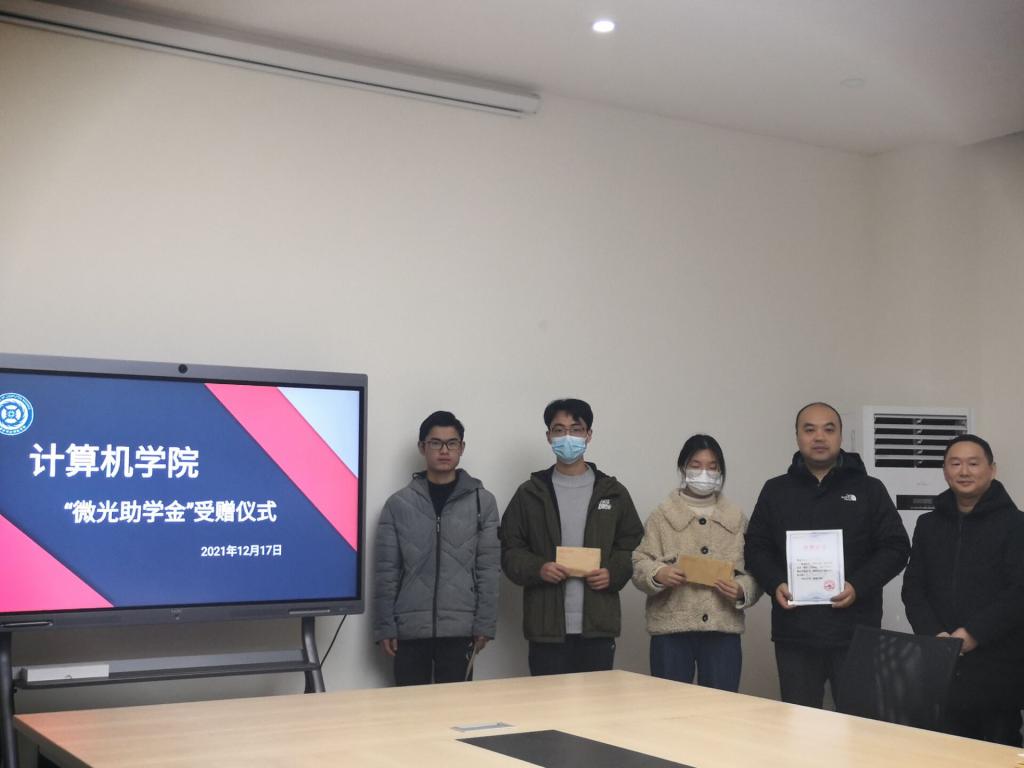 智能机器人工作室发起成立的“微光助学金"受赠仪式在10106会议室举行。学院党委副书记孟源、学院资助工作负责老师龚硕、受赠学生、智能机器人工作室指导教师游磊及工作室成员参与了活动。