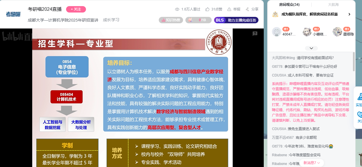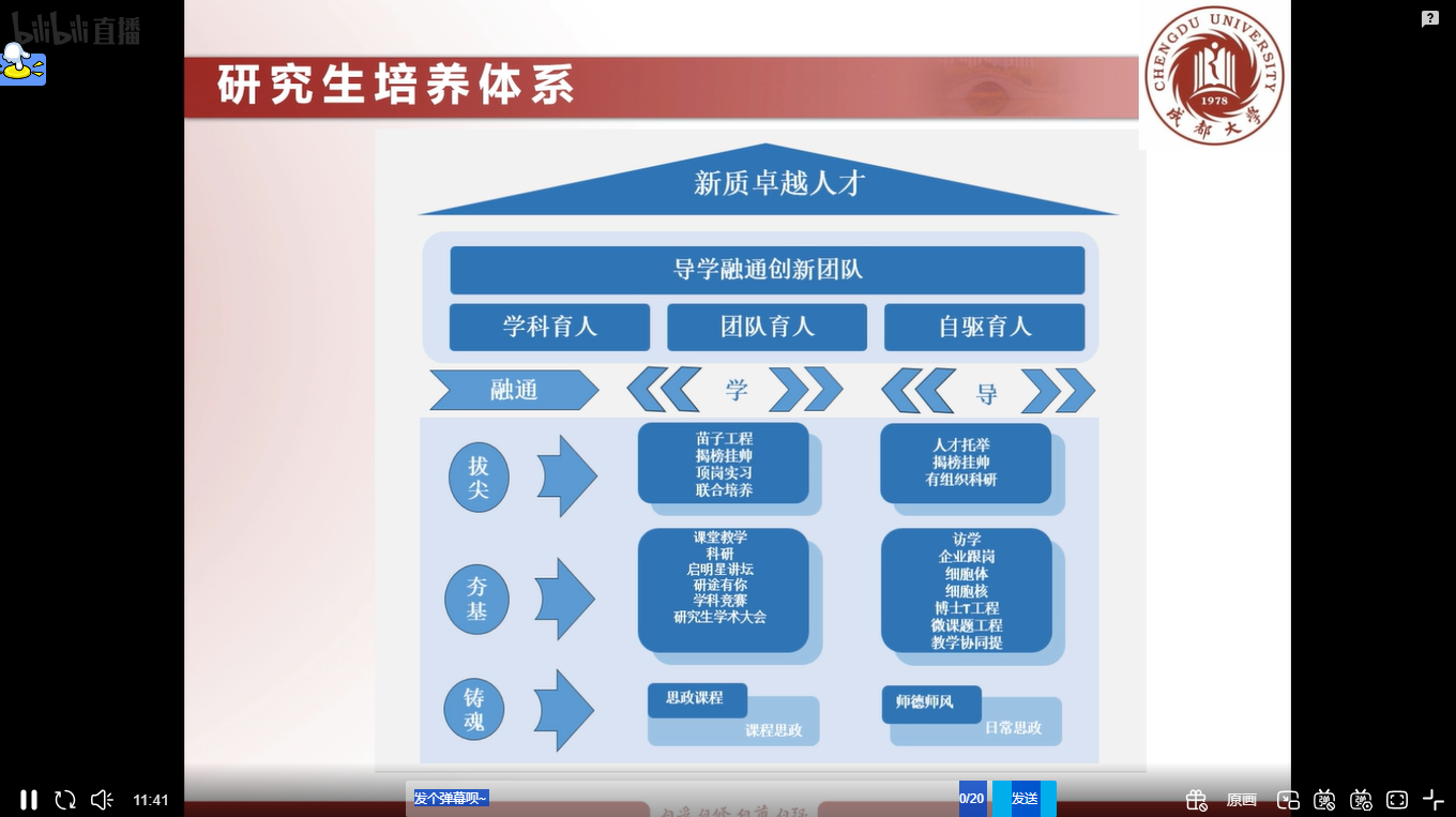 直播中,王进介绍了学院在专业、师资、平台、科研等基本情况,详细介绍了研究生培养体系、优秀导师代表,以及研究生日常学习生活情况。