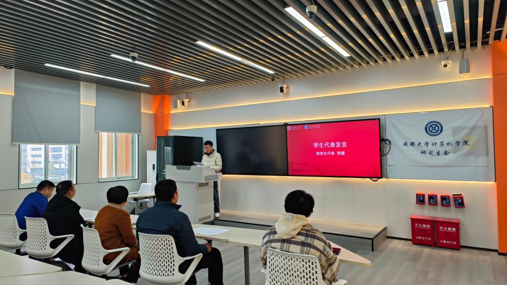 研究生代表贺健同学发言,表示研究生会将更好地连接学术资源,促进学术交流,帮助研究生调整学习状态,保持良好的学习节奏。