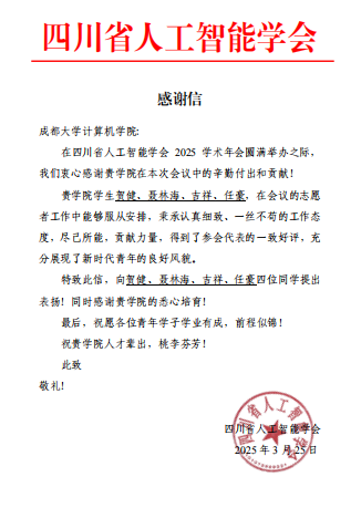 学院2024级研究生贺健、聂林海、吉祥、任豪四名成员担任志愿者,承担了现场接待、会务服务、人员引导等重要任务。在整个会议过程中,四位同学展现出高效、专业的志愿服务素质,积极配合主办方妥善解决现场问题,确保大会有序进行,获得与会嘉宾的高度评价。