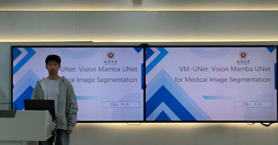 林立峰同学向大家讲解了“VM-UNet: Vision Mamba UNet for Medical Image Segmentation”。该论文针对传统RNN(循环神经网络)在长序列建模中的局限性,创新性地引入状态空间模型(SSM),并基于Mamba架构进一步优化,提出了专用于视觉任务的VMamba模型,最终构建出高性能的VM-UNet分割网络。其中VMamba的二维选择性扫描(2D Selective Scan, SS2D)机制,有效解决了传统扫描方式在空间信息建模上的不足,使模型能够更精准地捕捉医学图像中的关键特征。此外,VM-UNet显著提高了医学图像分割精度,展现了AI医疗应用的巨大潜力。