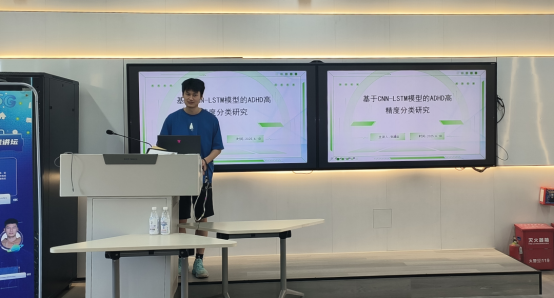 张通达同学则向大家介绍了“基于CNN-LSTM模型的ADHD高精度分类研究”,该论文介绍了一项基于 CNN-LSTM 模型的 ADHD 高精度分类研究。该研究利用 EEG 数据实时性与低成本优势,构建结合 CNN 空间特征提取和 LSTM 时间序列处理能力的模型,输入为 56 通道×385 时间点的 EEG 数据。在五折交叉验证中,模型平均分类准确率高达 98.23%,显著优于其他 CNN 模型。未来可拓展数据集、融合多模态数据并优化模型结构,有望进一步提升诊断准确性和泛化能力。