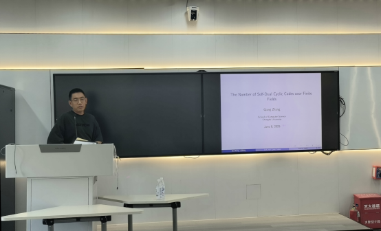 为了兼顾在场研究生的研究兴趣,张强博士选择以”The number of self-dual cyclic codes over finite fields”为题,聚焦有限域上自对偶循环码的数量研究。有限域上的自对偶循环码是一类特殊的线性码,它们在编码理论中具有重要地位。这类码不仅具有优美的代数结构,还在信息传输和数据存储中发挥着关键作用。它们能够有效地纠正传输过程中的错误,确保数据的完整性和可靠性,因而在通信系统和数据存储设备中得到广泛应用。张博士探讨了有限域上自对偶循环码的数量问题。通过对有限域上循环码的深入分析,张博士成功地推导出了在特定条件下自对偶循环码存在的条件,并进一步研究了这些码的数量特征,为自对偶循环码的实际应用奠定了更为坚实的理论基础。