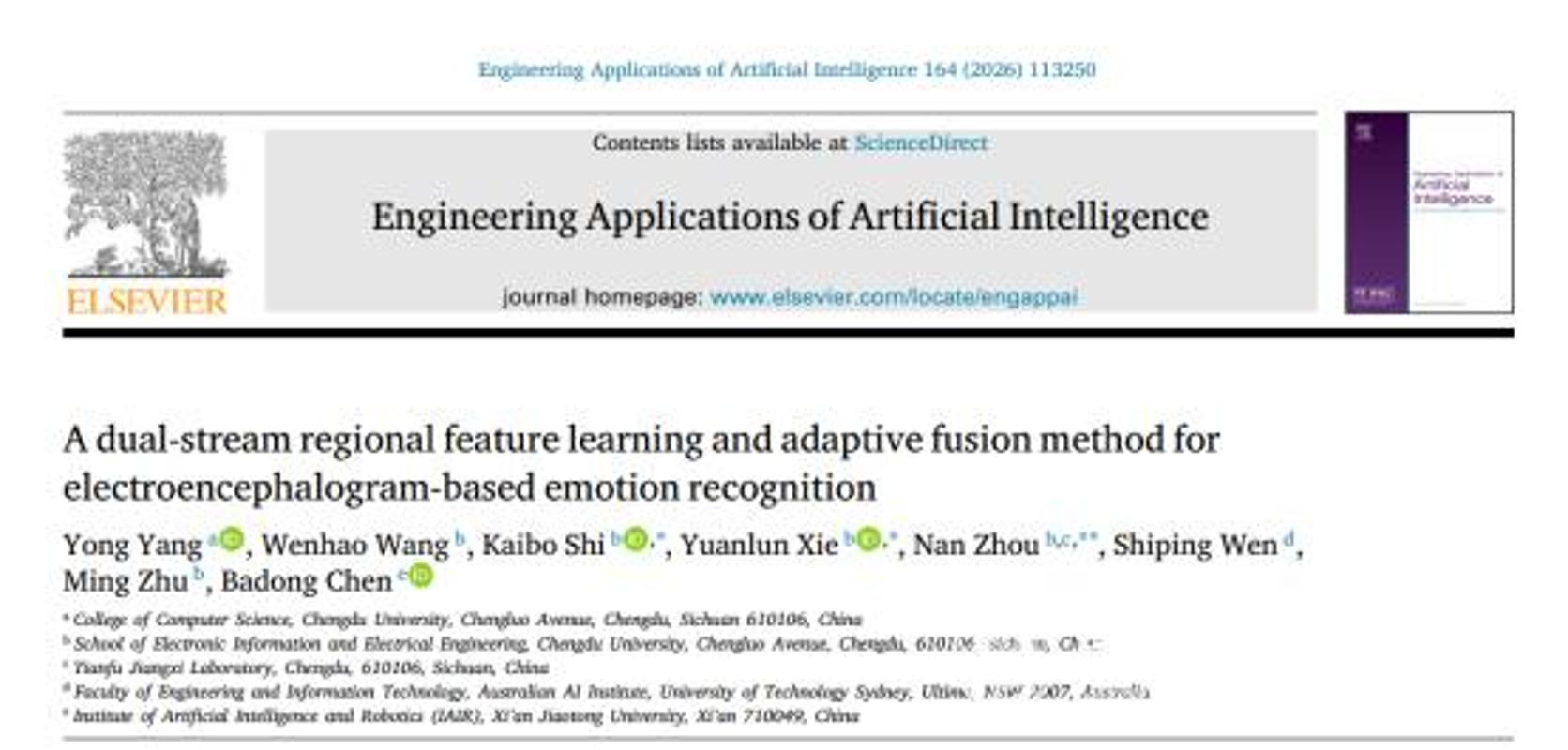 杨勇同学与王文昊、施开波(导师)、谢远伦、周楠等合作完成的科研论文A dual-stream regional feature learning and adaptive fusion method for electroencephalogram-based emotion recognition 在国际知名期刊 Engineering Applications of Artificial Intelligence (中国科学院一区top期刊,2025年影响因子8.0)正式发表。该研究围绕基于脑电信号(EEG)的情绪识别展开,针对现有方法在脑区建模与特征融合方面的不足,提出一个双流区域特征学习与自适应融合网络(DRFNet),在多项公开基准数据集上取得领域内领先的识别精度。