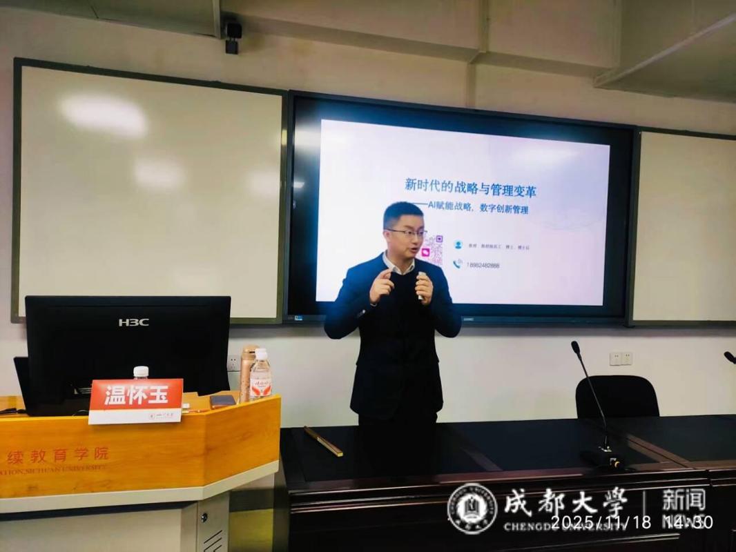 教授温怀玉应邀为四川大学承办的内蒙古能源公司优秀领导干部研修班,作《新时代的战略管理变革,AI赋能战略,数字创新管理》专题讲座,深度开展学术研讨与实践经验分享。学校计算机科学与技术专业研究生导师许明强、柳炳奇、姚远参与。