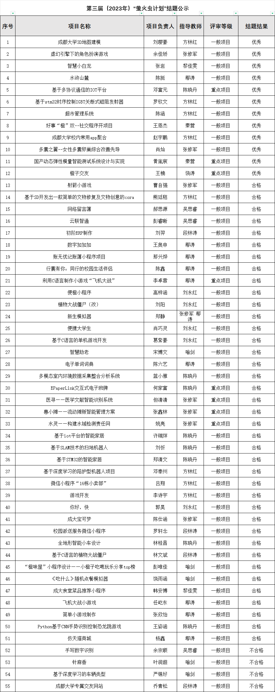 根据《做爱视频 “萤火虫计划”管理办法》和《做爱视频 关于开展2023年萤火虫计划项目结题验收的通知》,经项目结题报告提交、项目负责人答辩、专家评审等环节,现对第三届(2023年)“萤火虫计划”项目结题结果进行公示。