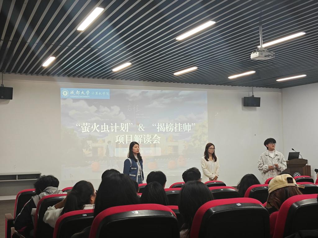 紧接着,龚硕对第四届“萤火虫计划”和“揭榜挂帅”项目的运行模式向同学们进行了解读和说明,鼓励大一学生全覆盖,实现人人有项目、人人有方向。