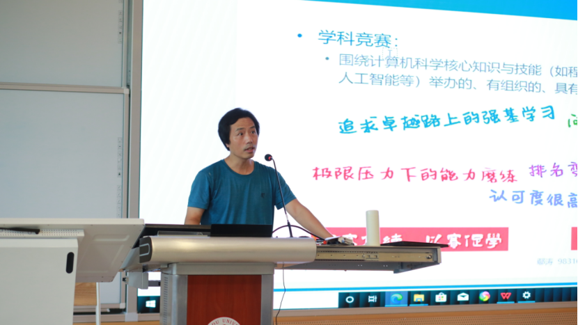 秦营老师系统介绍了学院的学科竞赛体系,重点解读了"蓝桥杯"全国软件和信息技术专业人才大赛、ACM-ICPC国际大学生程序设计竞赛、"互联网+"大学生创新创业大赛等多项重要赛事。通过展示学院历年参赛成果和优秀学子的成功经验,帮助新生建立对学科竞赛的全面认识。