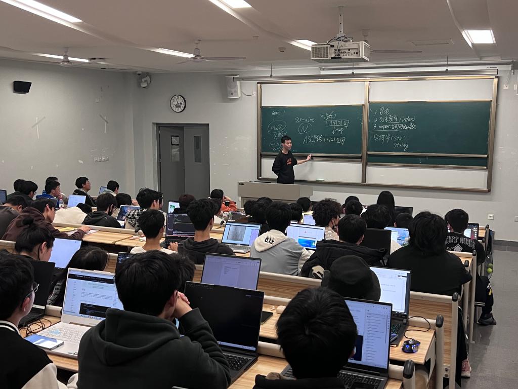 晚上7点整,学长课堂正式开始。各方向通过点名等方式清查本班人数。随后,任课学长站上讲台进行授课。他们秉持严谨、负责的态度,认真备课,讲清重点,给学弟学妹们树立了良好的榜样形象。Python方向主讲人是cdu学长科创工作室技术方向主任郭子恒。作为技术主任,在授课过程中,他不仅将学术知识倾囊相授,还以自身经历给学弟学妹们传授生活经验。台下学生听得聚精会神,纷纷被郭学长的教学内容所吸引,全身心融入到学长课堂当中,教学效果显而易见。