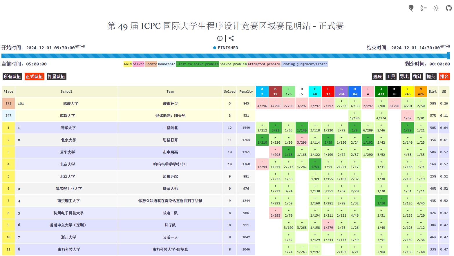 本次比赛的最终榜单链接如下://board.xcpcio.com/icpc%2F49th%2Fkunming?group=official