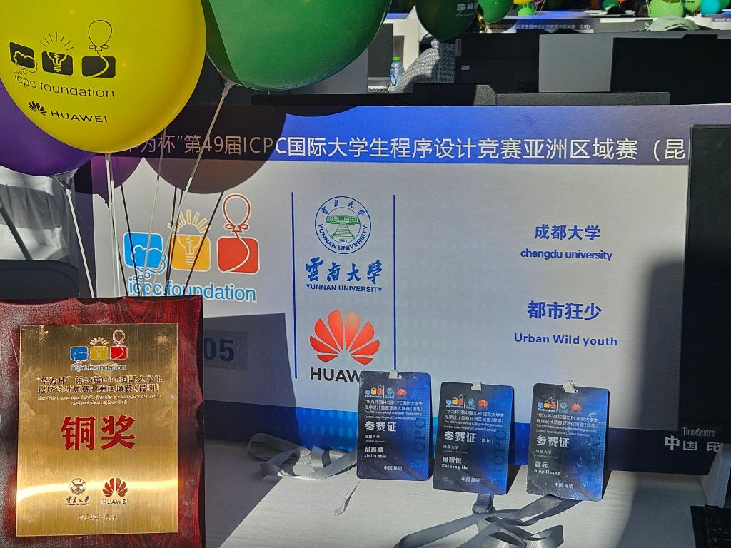 由张修军老师指导的两支队伍参加现场比赛,最后由何智恒(计科22-2)、翟鑫麟(计科22-1)、黄兵(软工22-1)三位同学组成的代表队,凭借出色的表现,荣获铜牌。这是本校首次在区域赛中获得奖牌,也是我校参加ACM-ICPC以来取得的历史最好成绩。