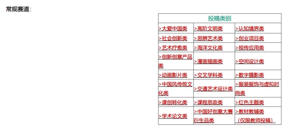 本届大赛学生组共设23个投稿类别,以每个院校不同的二级学院(系)为投稿单位,每个类别(论文类除外,论文类每个学生或老师,只能投稿一篇论文,且为未发表过,以及与创意、设计、数字媒体等相关专业有关的文章)最多投搞20件作品;教师组24个类别,教师作品投稿数量不限。