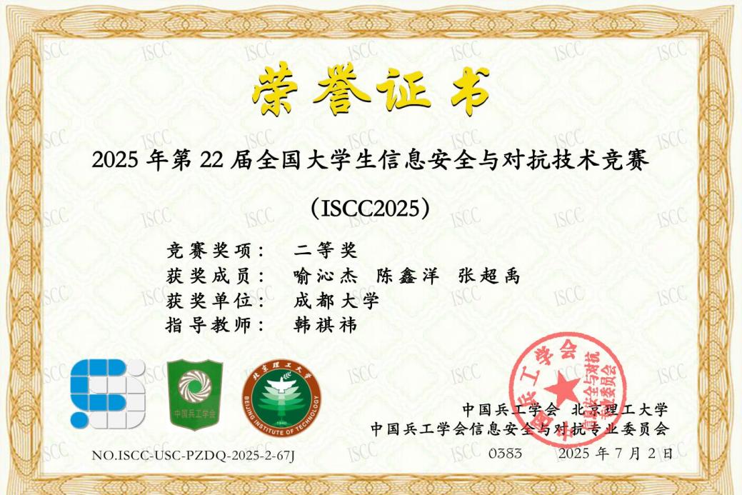 全国大学生信息安全与对抗技术竞赛是国内信息安全领域的高水平权威赛事,吸引了来自全国各大高校的顶尖网络安全人才同台竞技。本届比赛竞争尤为激烈,赛题涵盖密码学、逆向工程、漏洞挖掘、网络攻防等多个核心领域,全面考察选手的技术实力与创新应变能力。面对复杂多变的题目和强劲的对手,喻沁杰、陈鑫洋、张超禹三位同学沉着应对,充分发挥团队协作精神,在连续数小时的高强度比赛中展现出扎实的专业基础和出色的实战能力。